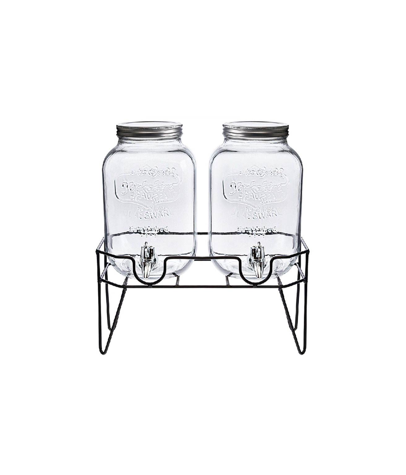 A 4L glass beverage dispenser with 2 taps and silver metal lids.