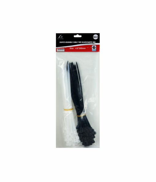 The Reusable Cable Tie Black & White 100pc set (4.6x200mm) offers a sustainable and versatile solution for organizing cables and wires.