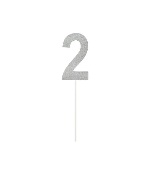 This sparkling cake topper has a number 2 made of card with silver glitter on one side attached to a plastic stick.