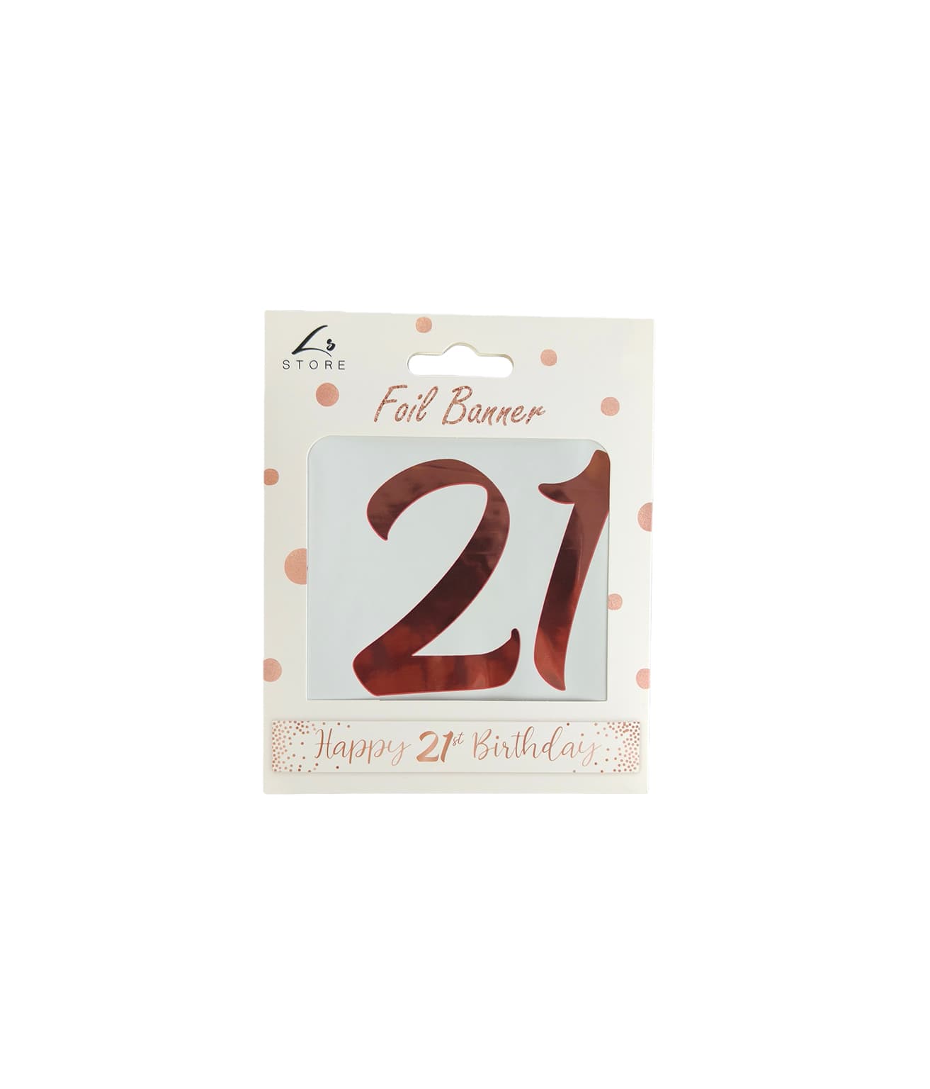 21st Rose Gold Foil Banner, measuring 12.7cm x 365.8cm. It features rose gold foil “21” lettering and “Happy 21st Birthday” wording, ideal for marking 21st birthday milestones.