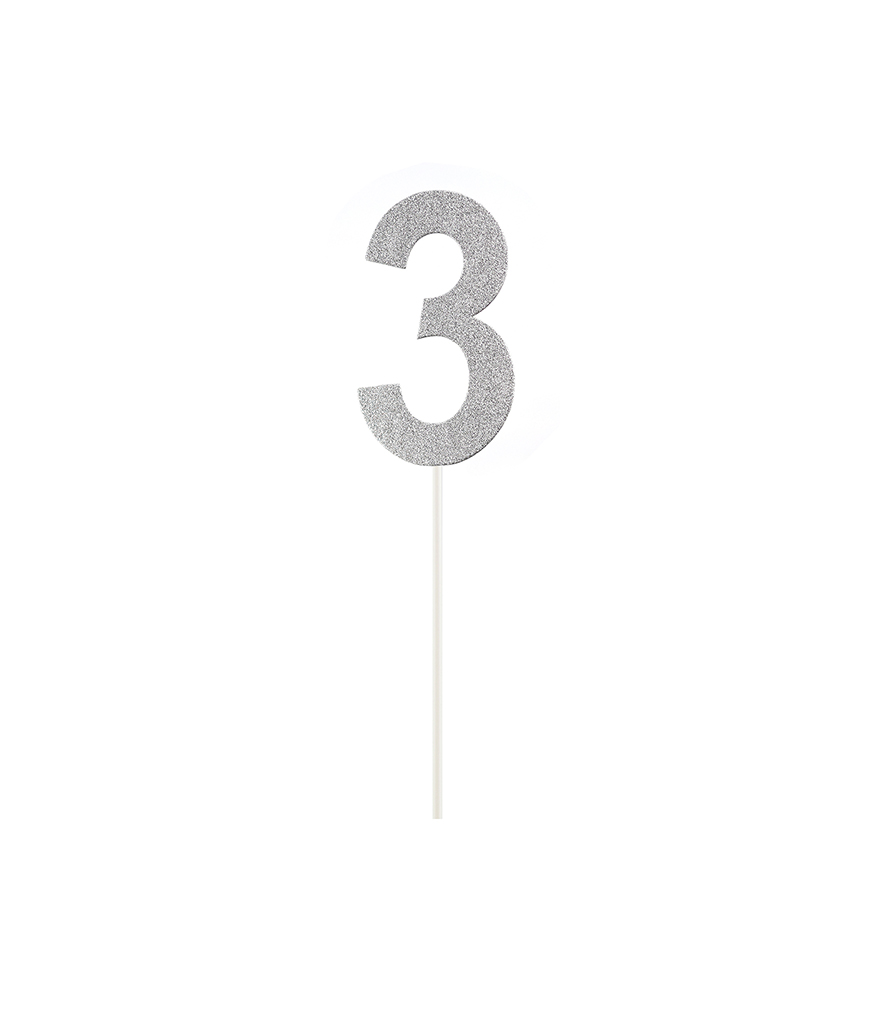 This sparkling cake topper has a number 3 made of card with silver glitter on one side attached to a plastic stick.