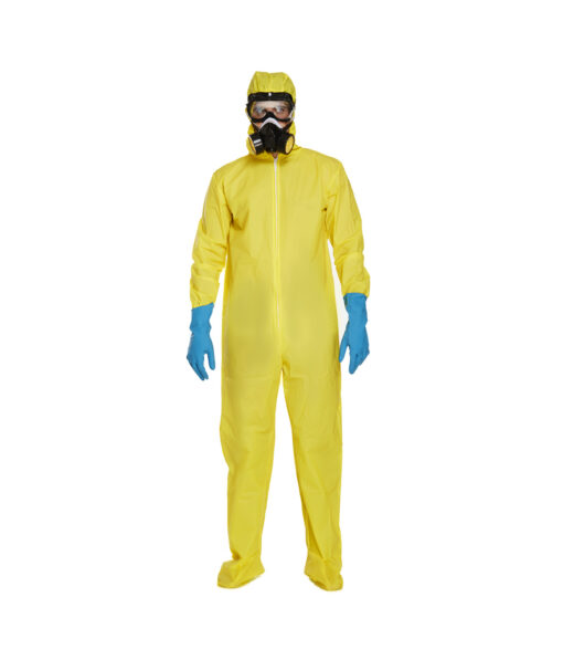 This costume for men features a yellow jumpsuit with googles, mask pieces.