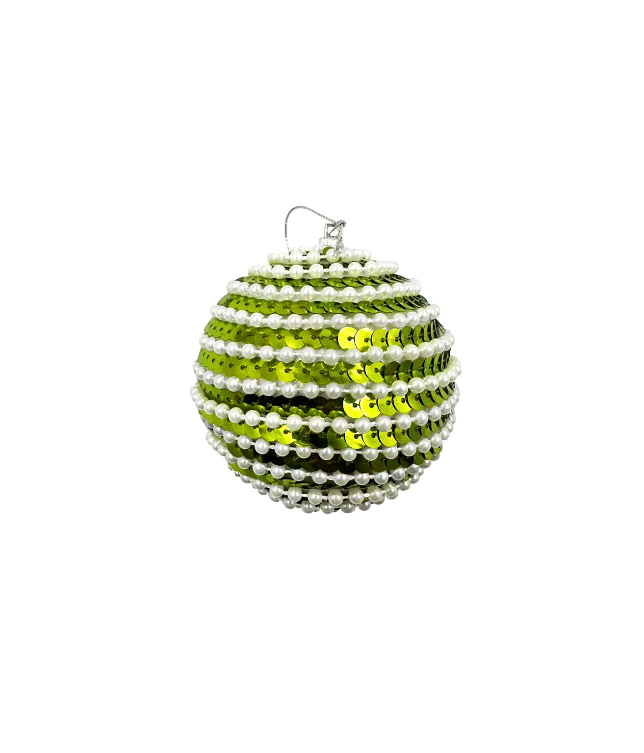 Add a fresh pop of sparkle to your festive display with the Apple Green Sequin Christmas Ball With White Beads 8cm.