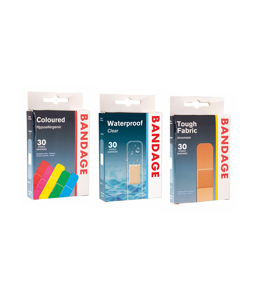 This convenient pack includes 30 assorted bandages in a choice of coloured, waterproof, or tough fabric varieties.