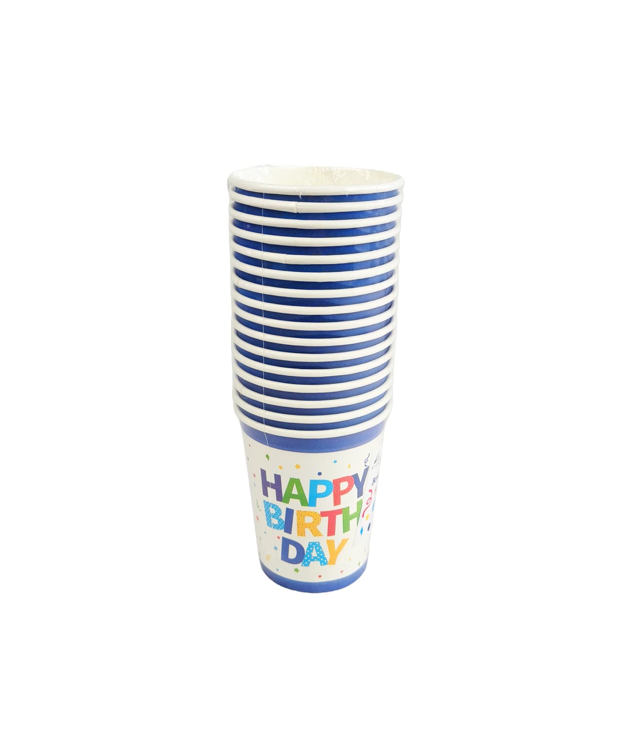 Birthday Boy Paper Cup, 9oz in capacity with 16 pieces per pack. It features “HAPPY BIRTHDAY” lettering and festive patterns, suitable for serving drinks at boys’ birthday parties.