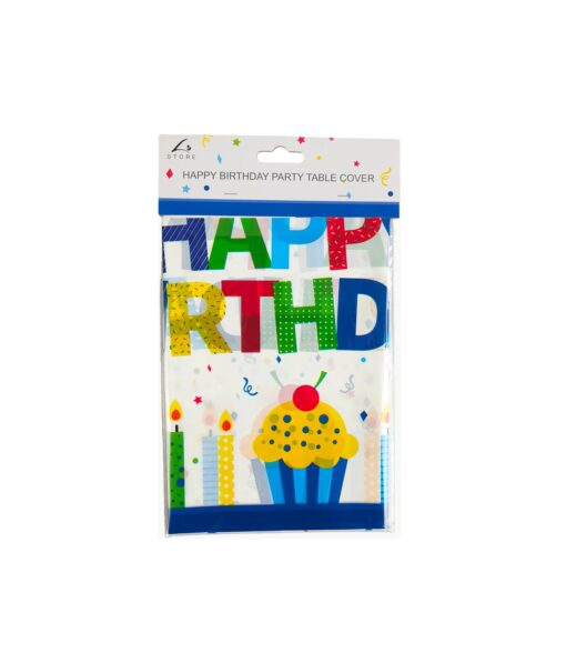 It features “HAPPY BIRTHDAY” lettering and birthday-themed patterns, suitable for covering tables at boys’ birthday parties.