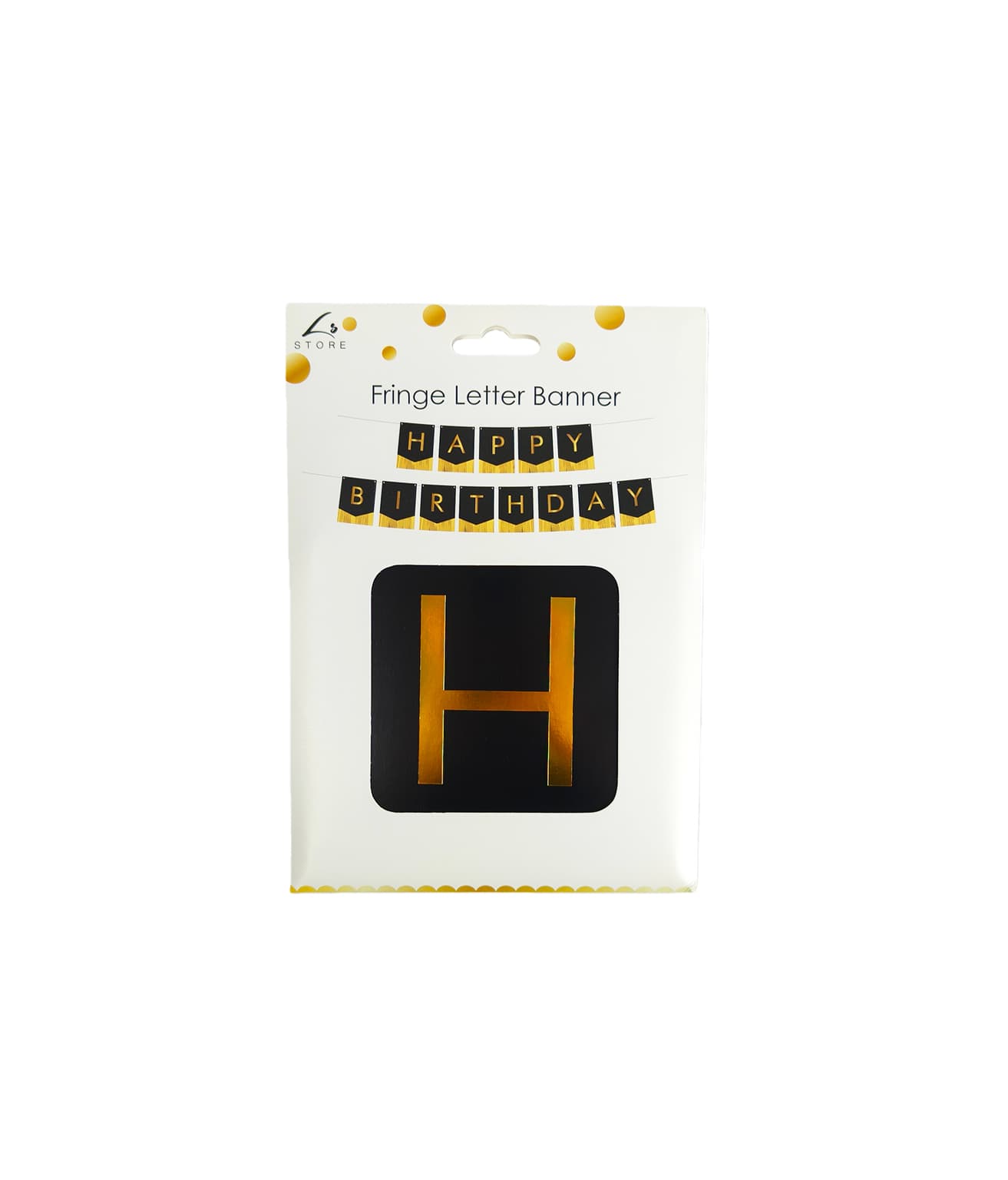 Black Happy Birthday Letter Fringe Banner, 13 letter flags in total, 3 meters long, with each flag sized 20cm x 15cm. Made of 250g thick cardstock with hot stamp letters and golden foil fringe on the bottom, it’s a premium decorative piece for elegant birthday parties.