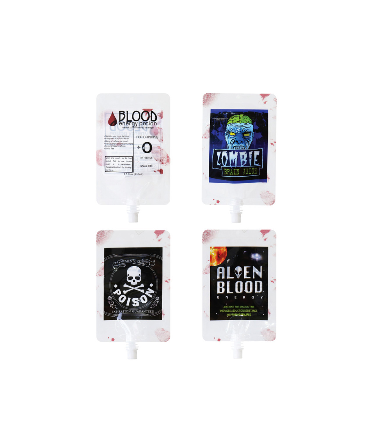 These spooky blood bag-style pouches come with assorted creepy label designs, perfect for Halloween parties or haunted house vibes.