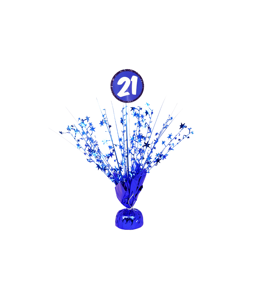 Our blue 21st birthday table centerpiece really pulls a table setting together and features long foil strands and bendable wire pieces with foil stars attached, this weighted table centerpiece can be shaped to suit your party theme.
