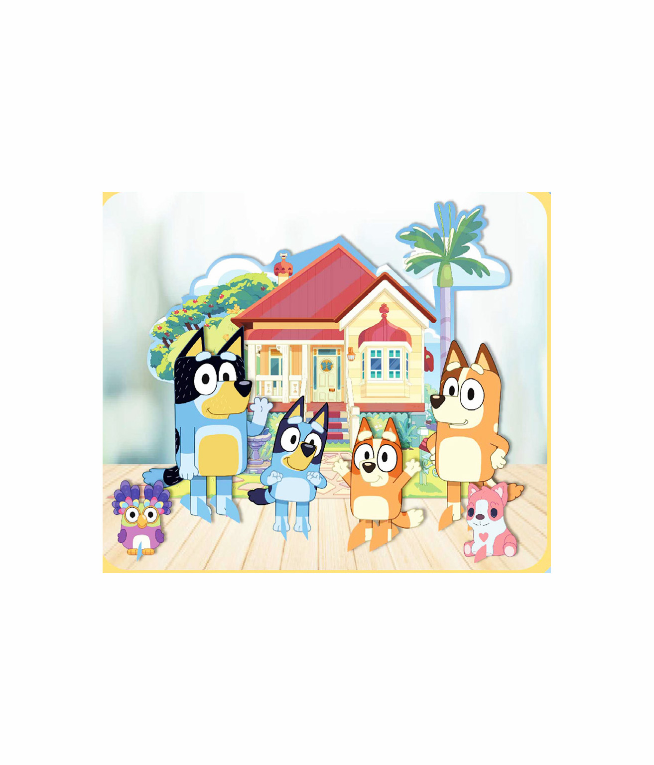 Includes various sized cardboard pieces featuring Bluey and friends to create a playful table setting.
