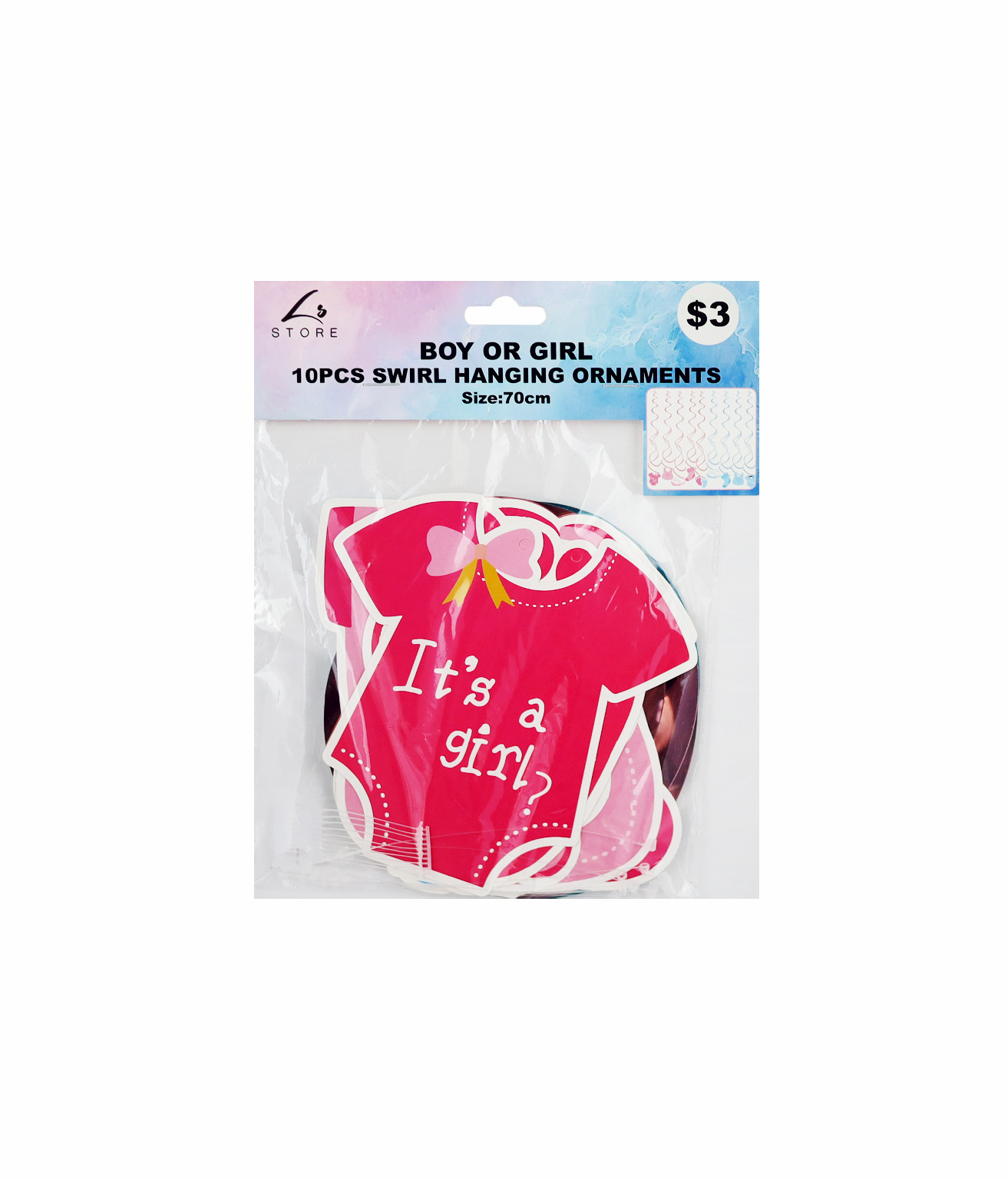 Celebrate the excitement of gender reveal parties with our “Boy or Girl Swirl Hanging Ornaments.”