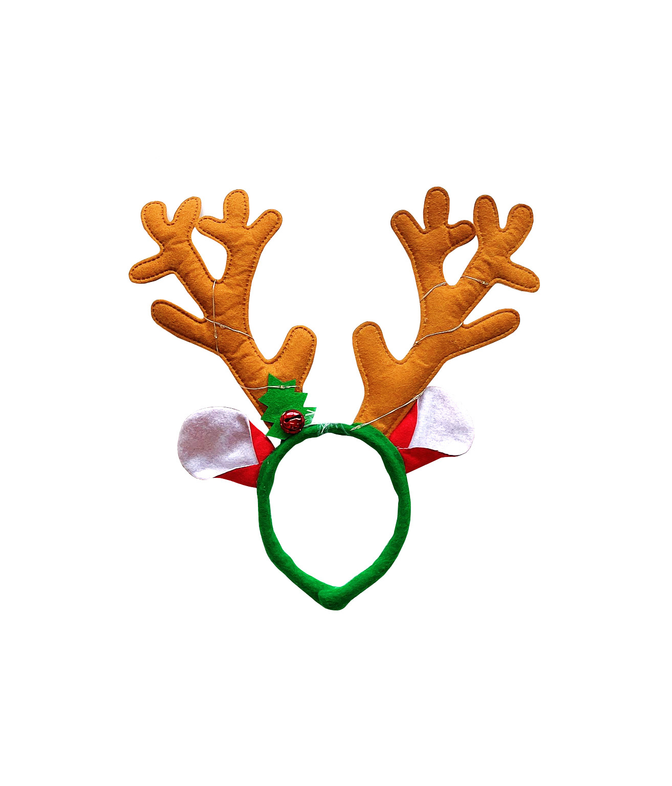 Featuring soft brown antlers and attached ears on a green base, it’s a playful accessory for holiday fun and reindeer-inspired outfits.