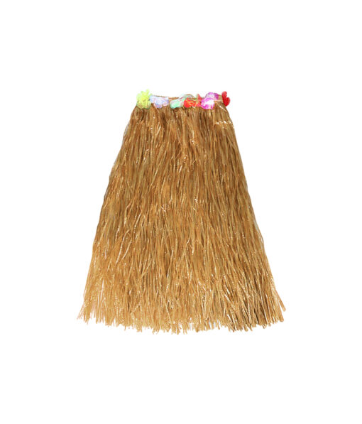 Our Hula Skirt is a raffia-like plastic dance skirt with fabric hibiscus flower accents.