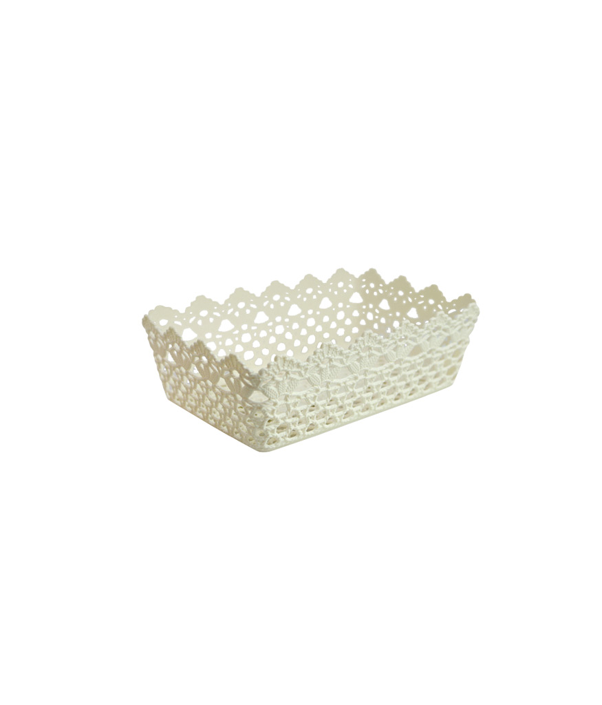 Cream color plastic storage bin.