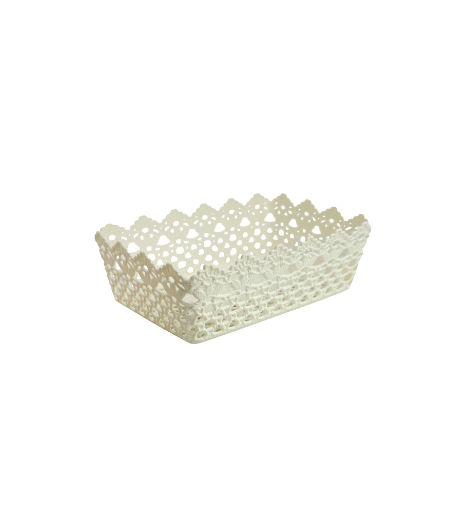 Cream color plastic storage bin.