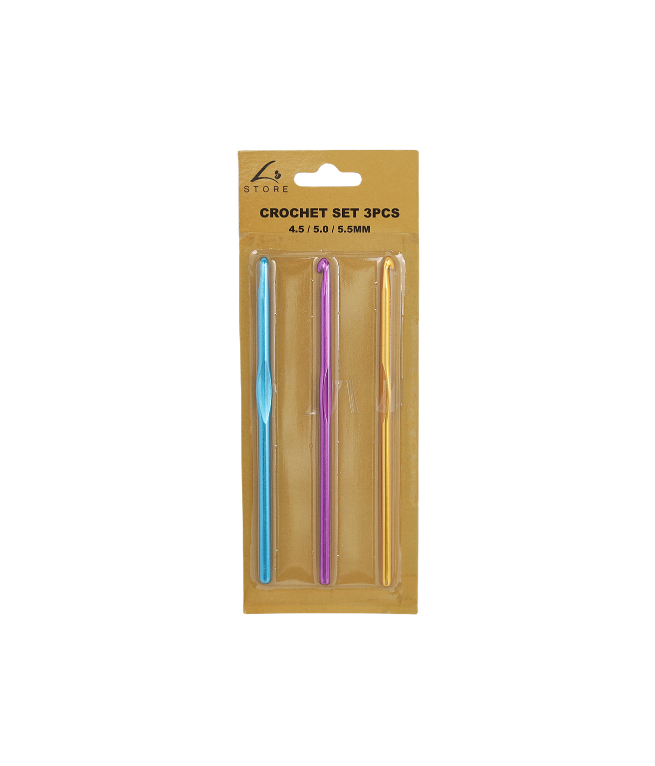 The Crochet Set (3pc) includes three high-quality crochet hooks in sizes 4.5mm, 5mm, and 5.5mm.