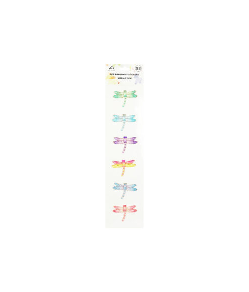 This pack contains 6 dragonfly-shaped stickers, each measuring 4.5 x 3 cm.