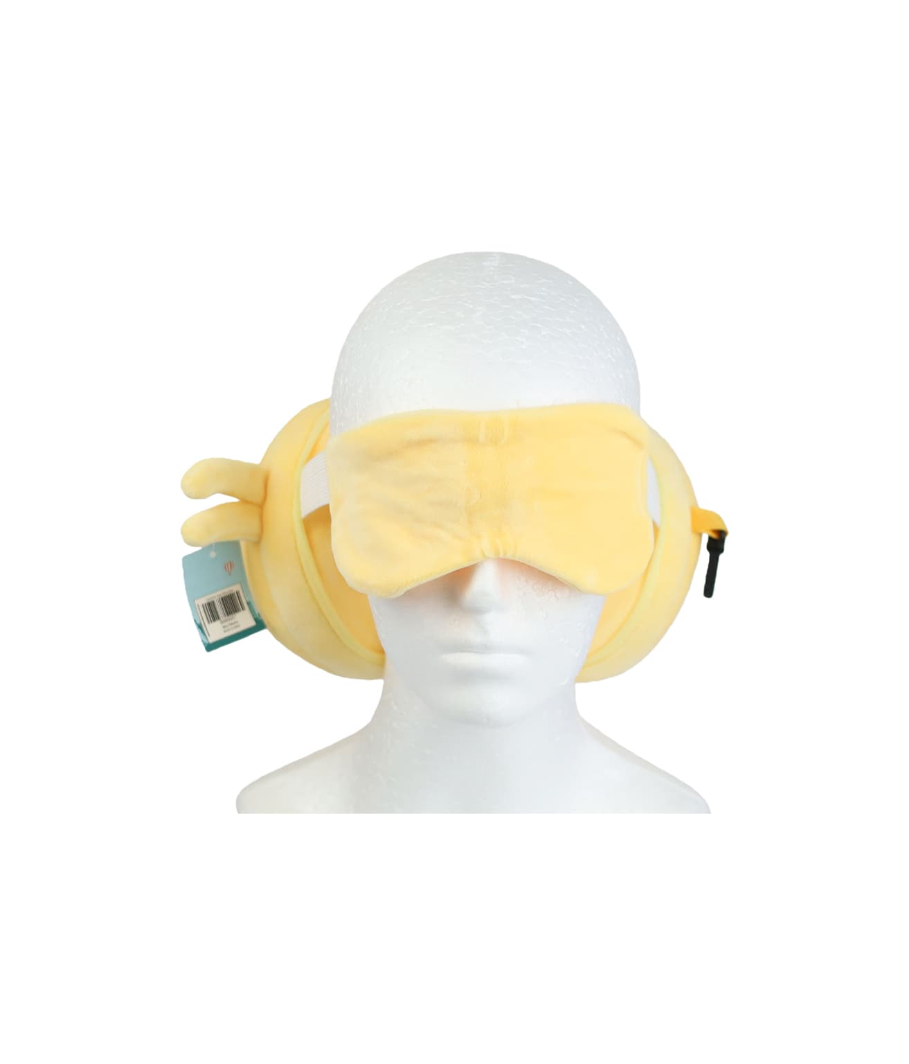 Ear cups travel pillow with eye mask designed to provide comfort, neck support, and light blocking during travel and rest. Ideal for use on planes, cars, trains, and at home.
