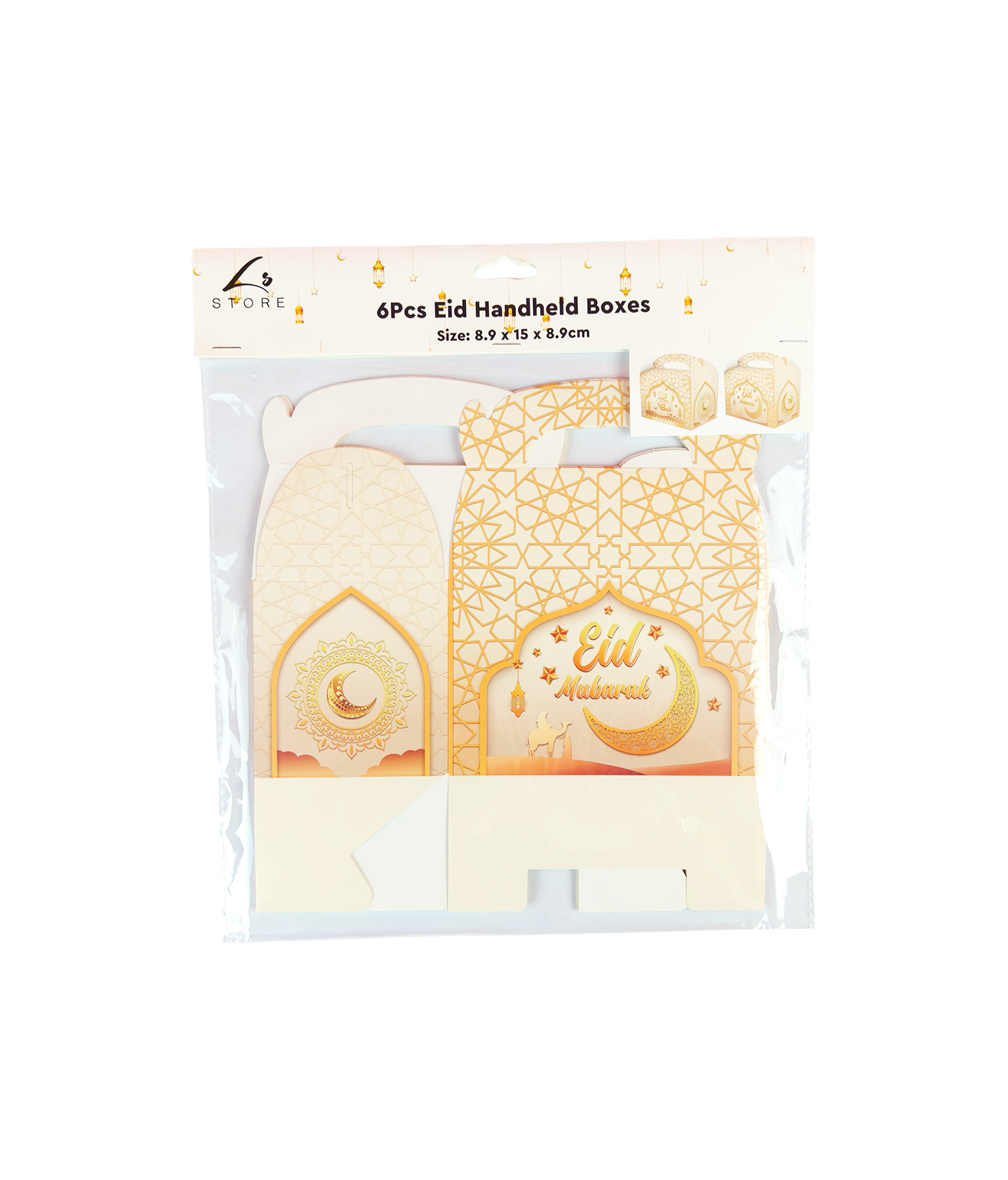 These Eid Handheld Boxes 8.9x15x8.9cm 6pc are a beautiful and practical way to share treats and favors during your Eid celebration.