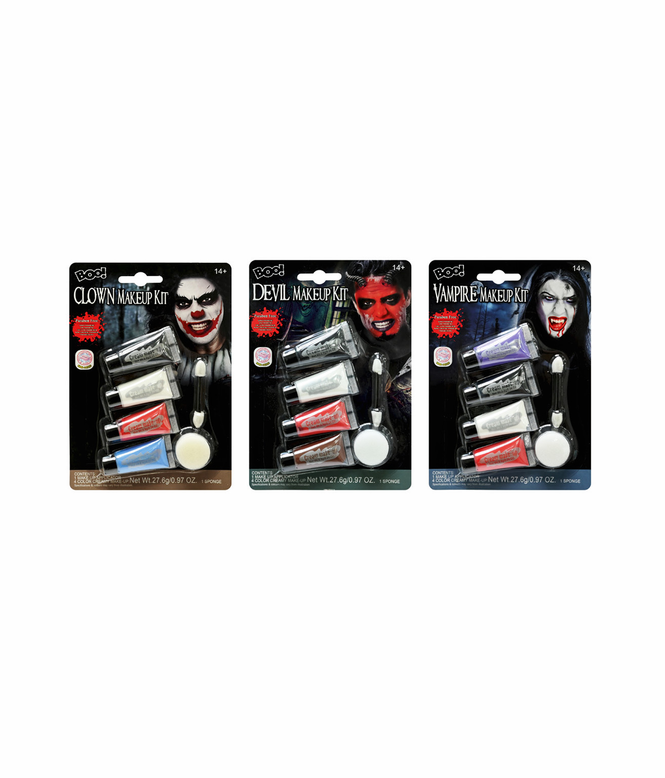 Each set includes themed colours to help you transform into a spooky clown, devil, or vampire.