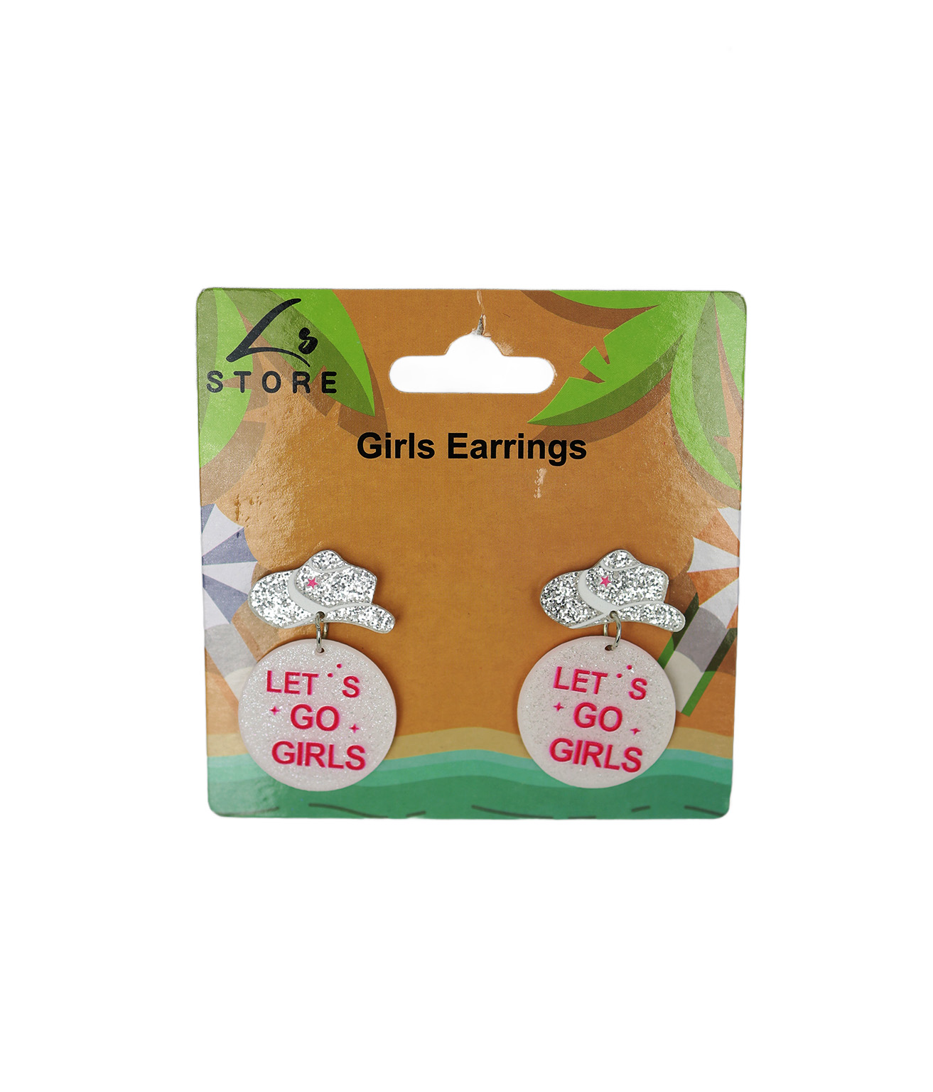 Featuring a glittery hat design with a playful “LET’S GO GIRLS” slogan on a circular board, these earrings are perfect for parties, celebrations, or simply making a bold statement.