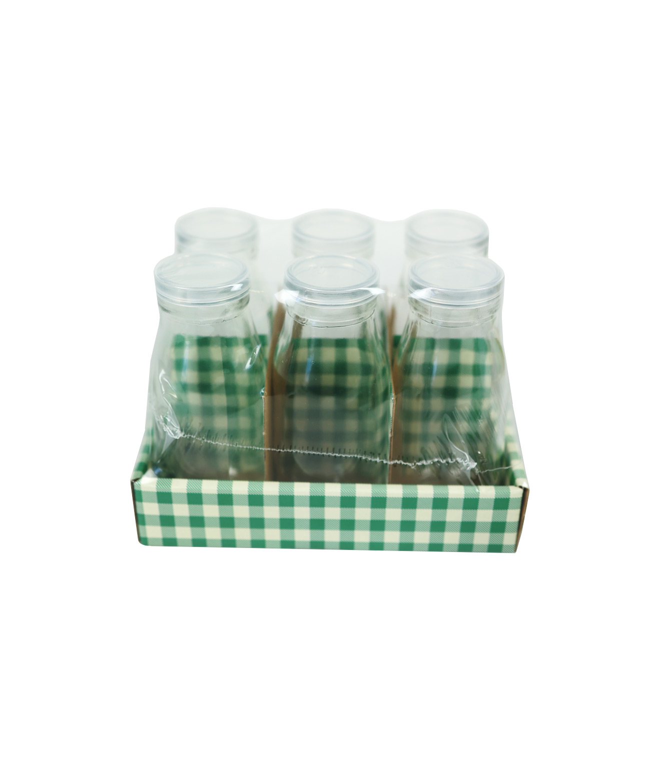 Keep your beverages and other liquids fresh and stylishly stored with this set of six glass bottles with PE lids.
