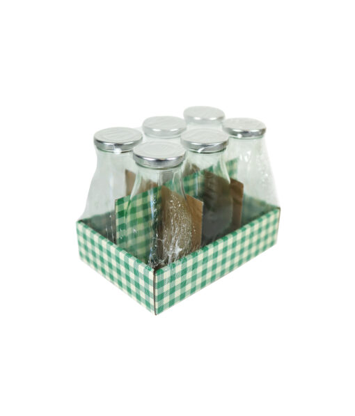 Keep your beverages and other liquids fresh and stylishly stored with this set of six glass bottles with tin lids.