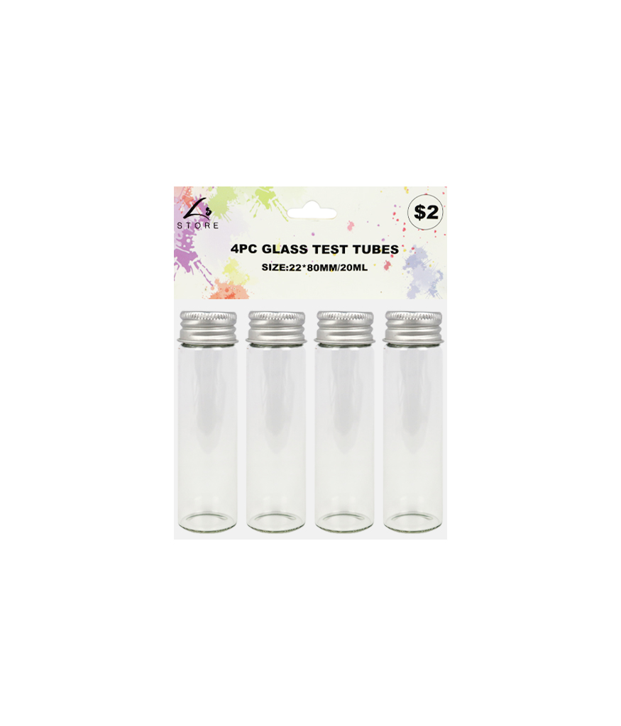 This 4-pack set includes 20ml test tubes, ideal for storing small quantities of liquids, powders, or specimens.
