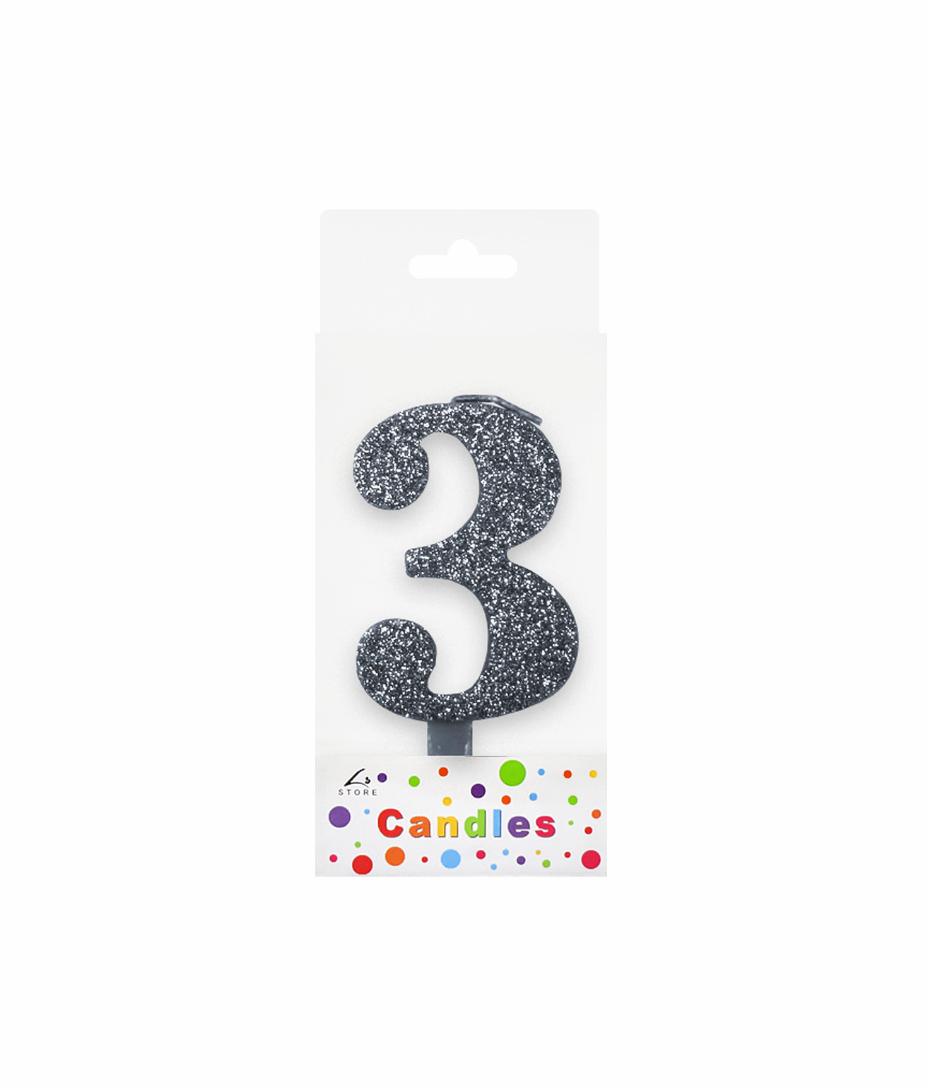 Add a sparkling touch to your celebration with our Glitter Silver Number Candle 3.