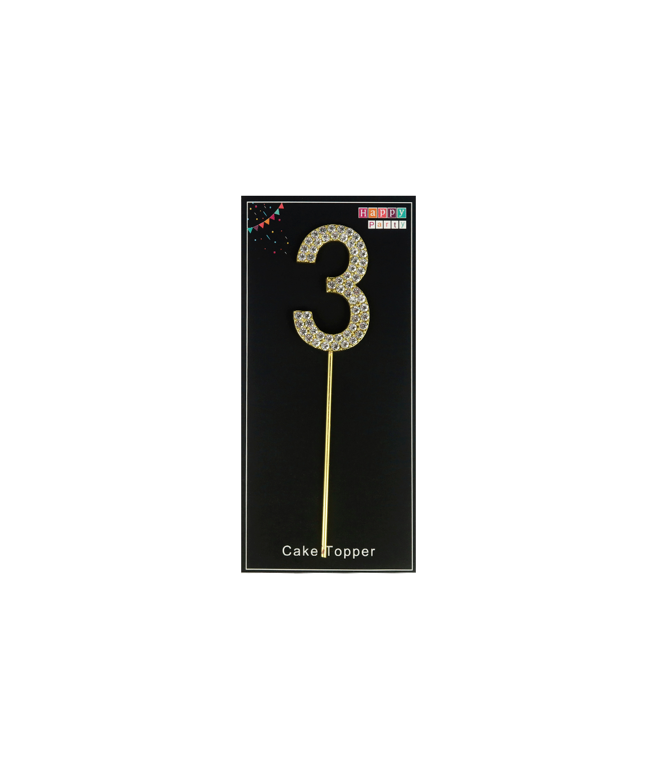 This shining cake topper has a number 3 decorated with diamonds and gold plating.