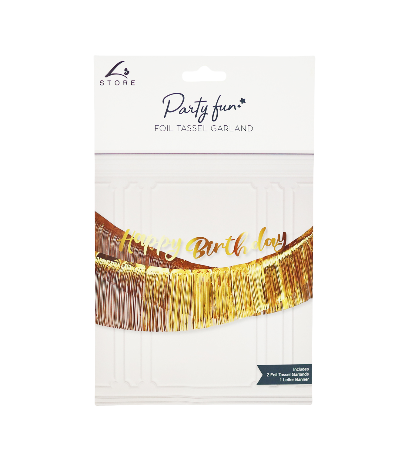 This elegant decoration set includes a shimmering gold letter banner spelling “Happy Birthday” and two matching foil tassel garlands.