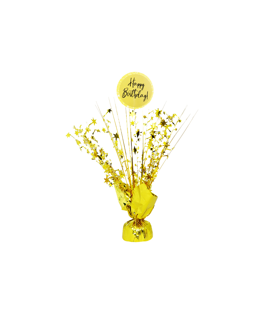 Our gold birthday table centerpiece really pulls a table setting together and features long foil strands and bendable wire pieces with foil stars attached, this weighted table centerpiece can be shaped to suit your party theme.
