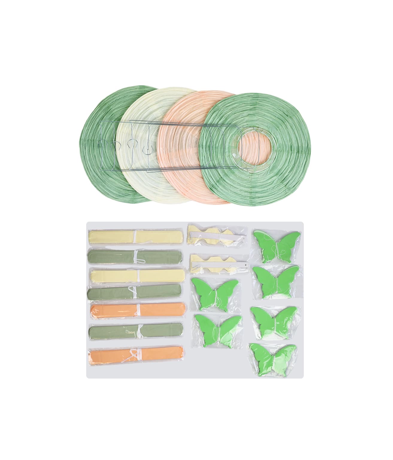 A 19 piece paper lantern set designed for parties, celebrations, and decorative displays. Includes lanterns, flowers, fans, and butterfly strings that create a coordinated and elegant atmosphere.