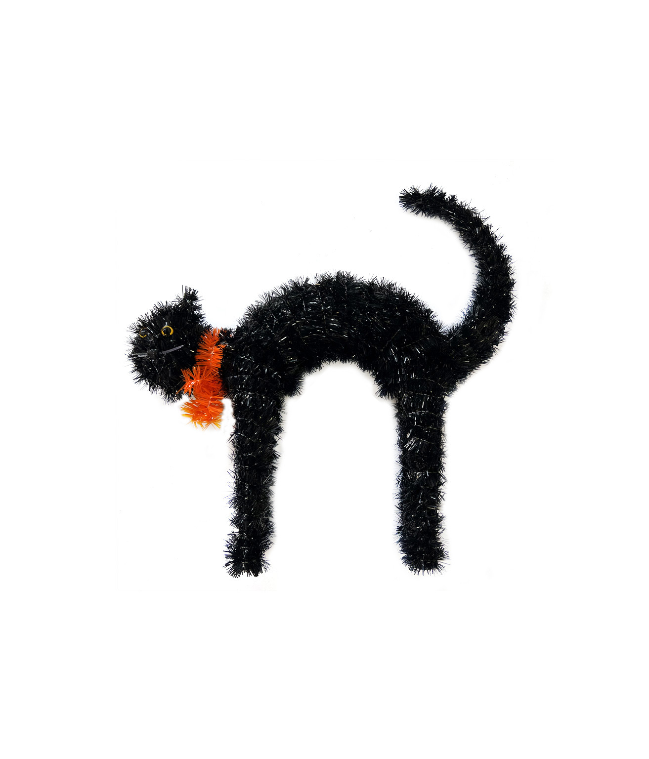 Featuring a shimmering black tinsel body and bright orange tinsel collar, its the purr-fect accent for your spooky setup.