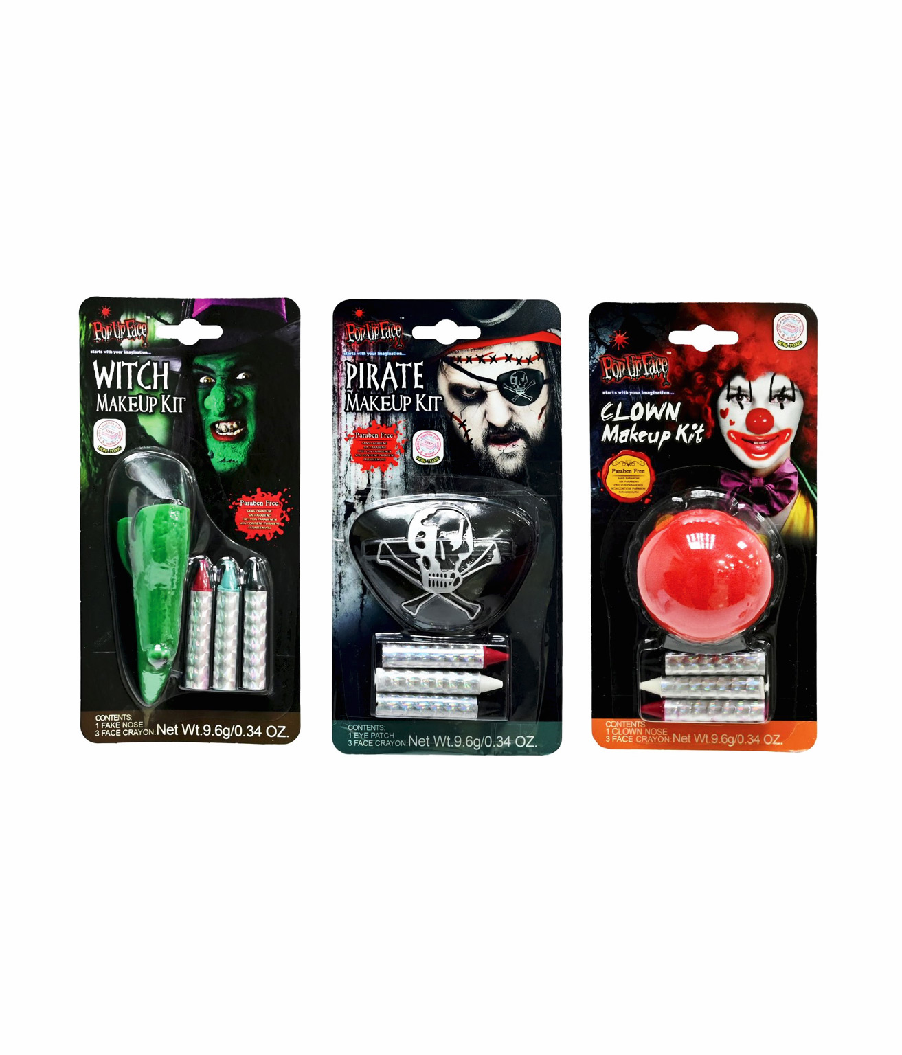 Each kit includes themed colours and accessories to help you become a wicked witch, daring pirate, or creepy clown.