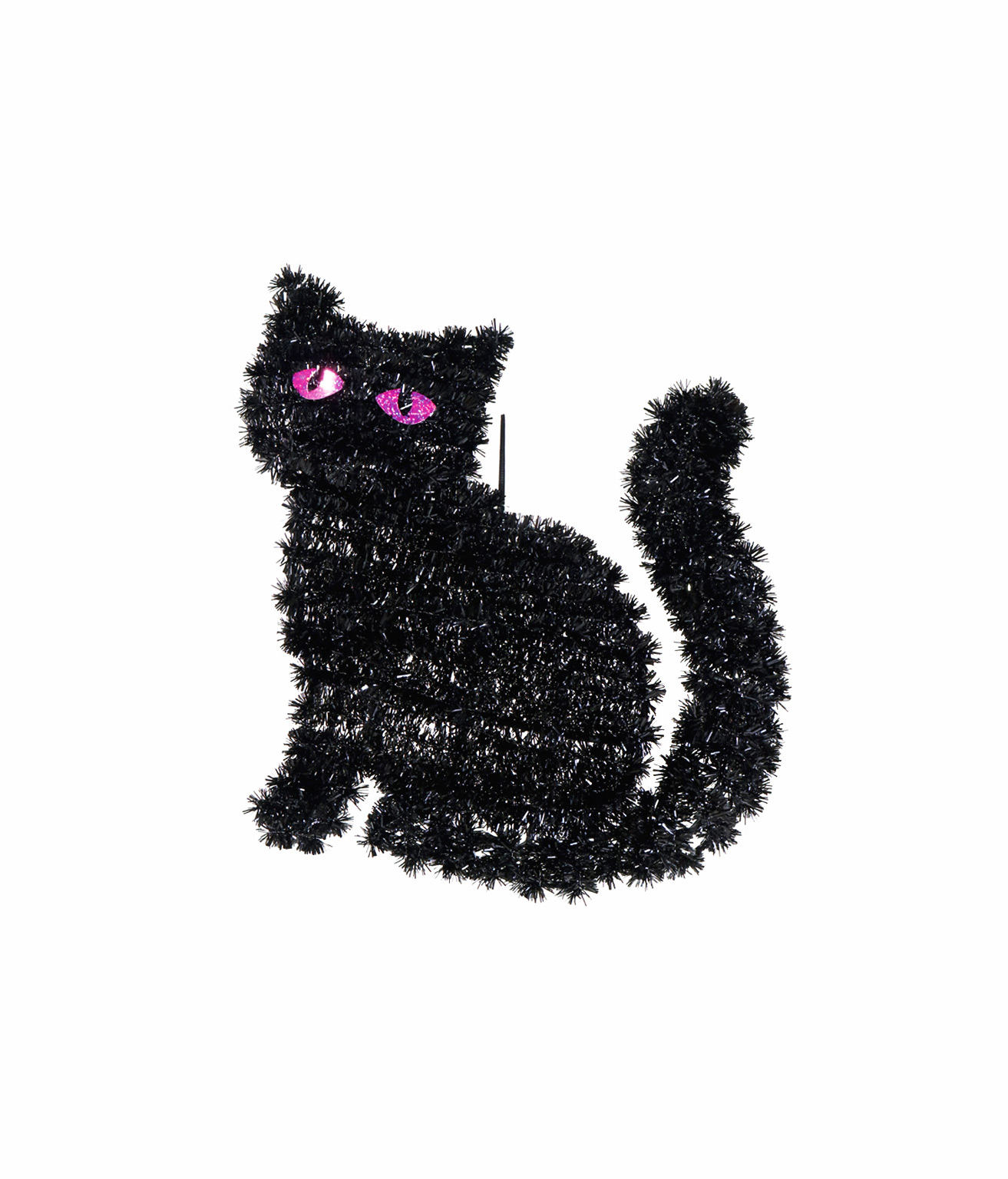 Featuring a sleek black tinsel cat with purple eyes, this hanging decoration adds spooky charm and festive sparkle.