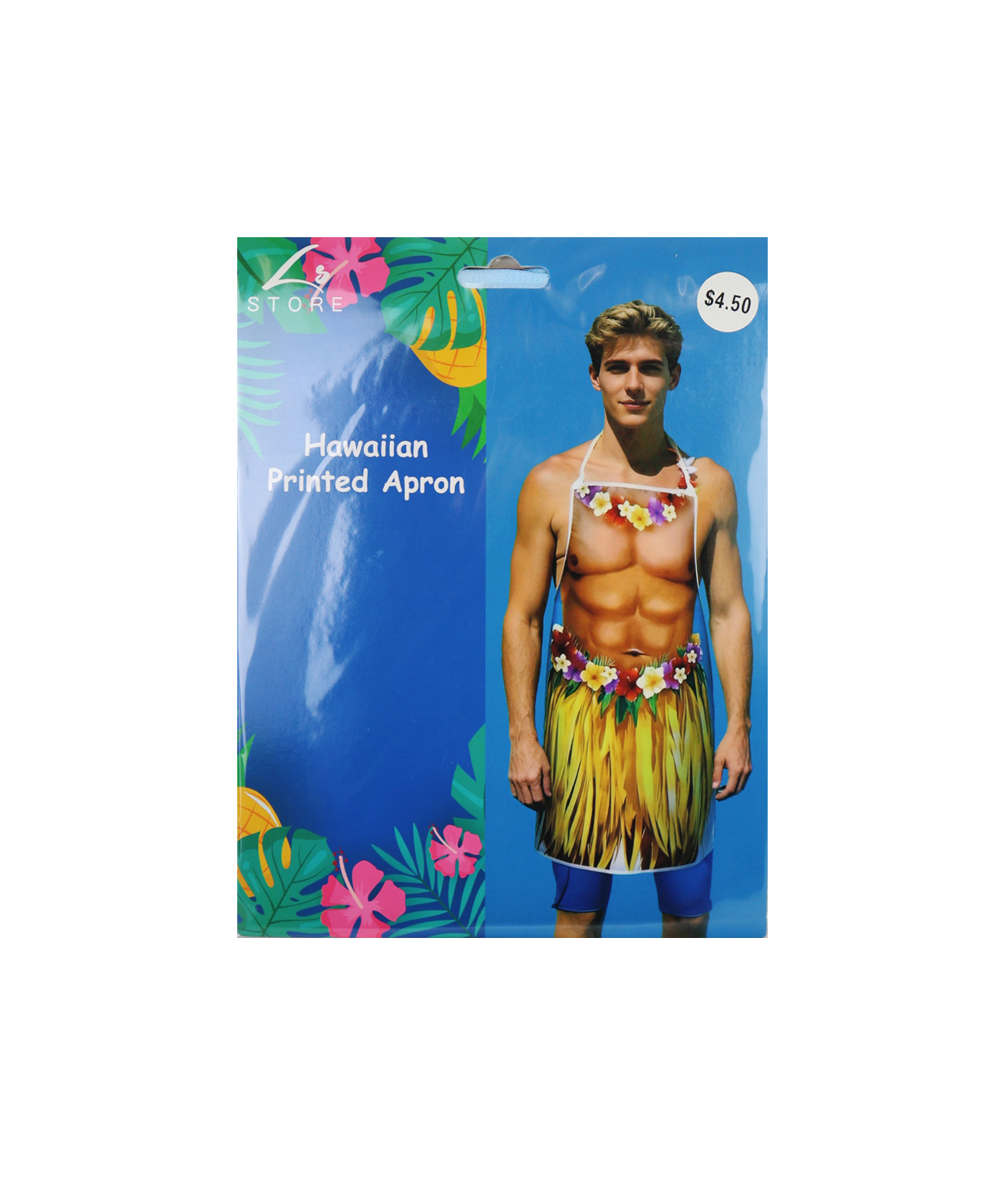 Bring fun and tropical vibes to your cooking or party with this Hawaiian Men’s Printed Apron, featuring a bold ab mens body printed design with a flower lei and hula skirt.