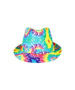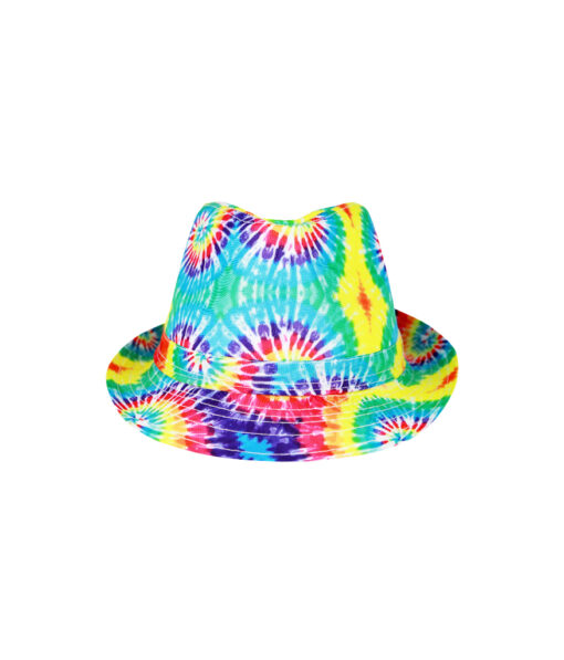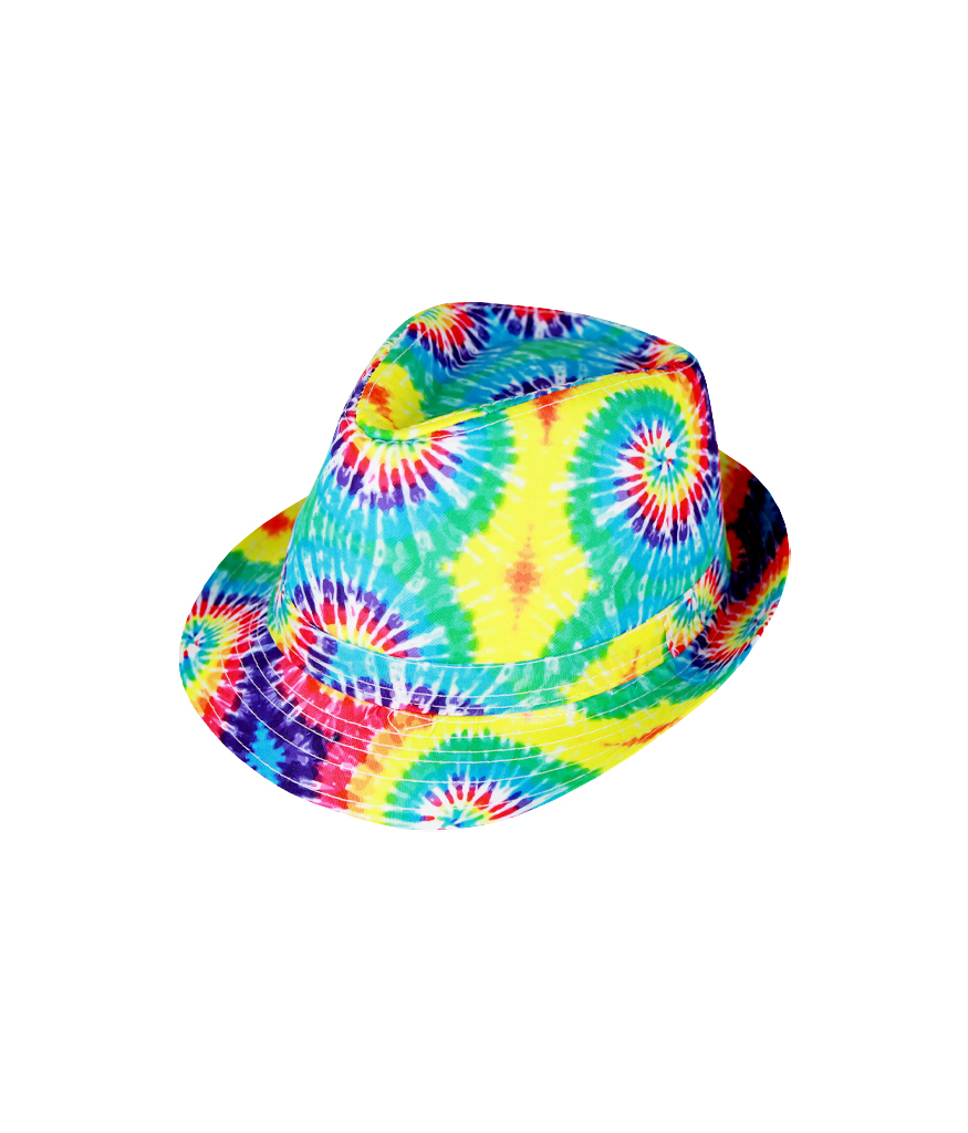 Featuring our hippie fedora with rainbow tie-dye patterns.