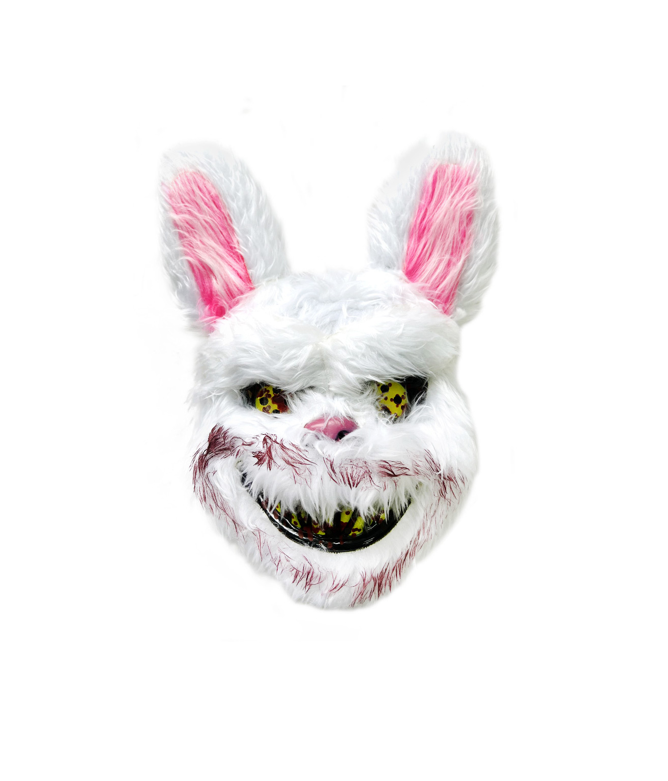 Features a white, spooky bunny face that blends innocent with terrifying.