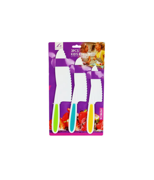 Set of 3 kids plastic knives designed for safe and fun participation in the kitchen.