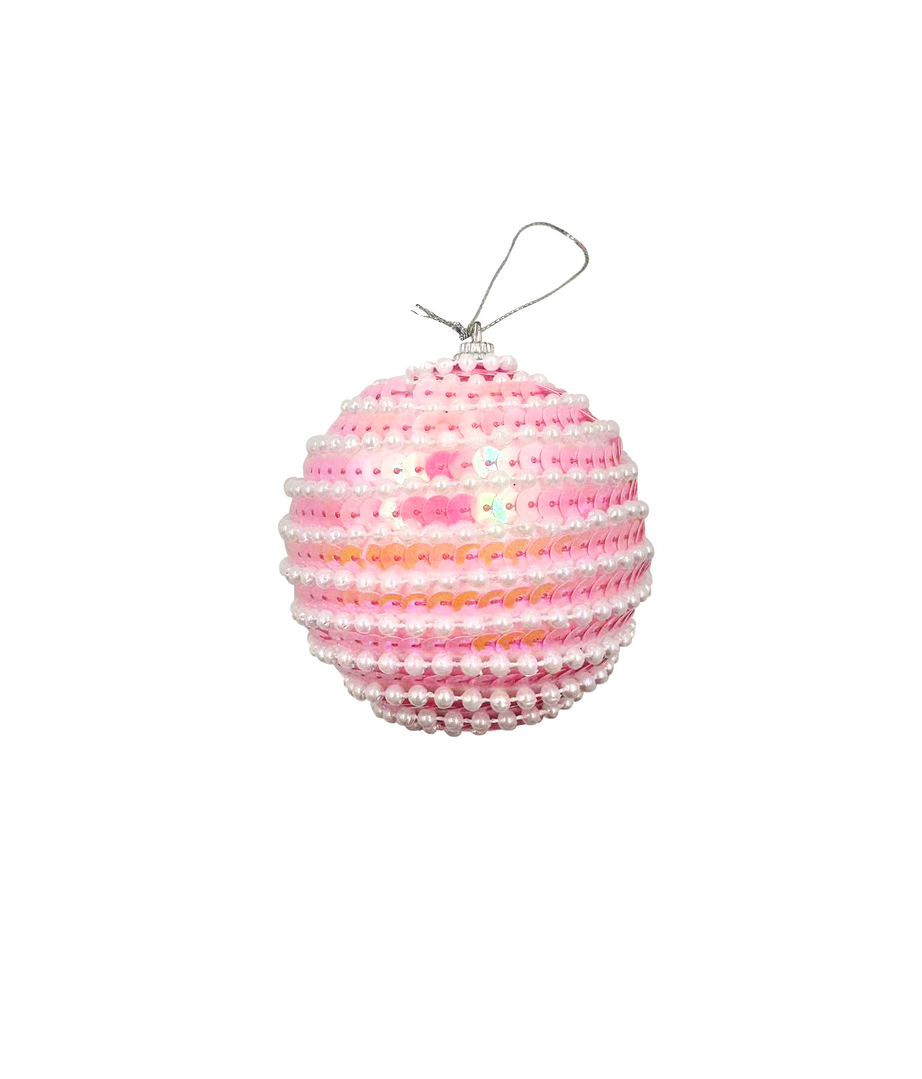 Add a soft and elegant shimmer to your festive decor with the Light Pink Sequin Christmas Ball With White Beads 8cm.