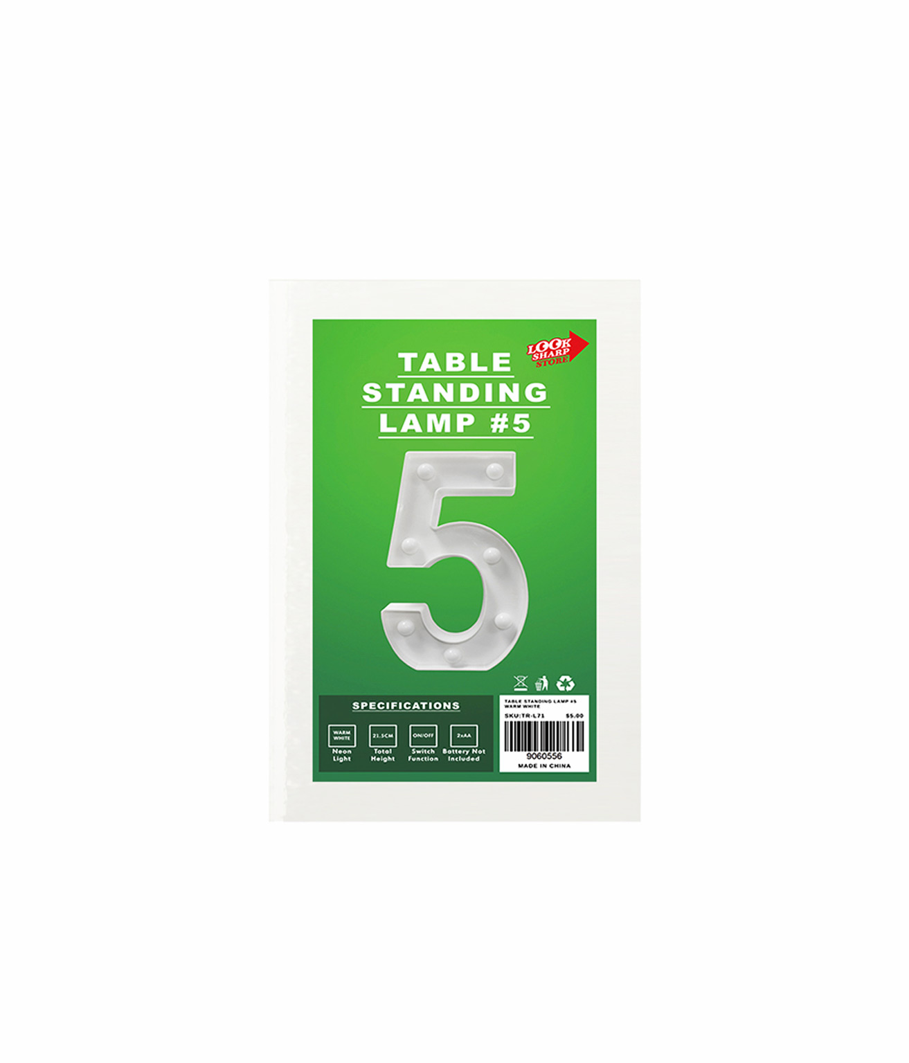 Featuring warm white LED lights, this number 5 lamp adds a bright and festive touch to any room, party, or special event.