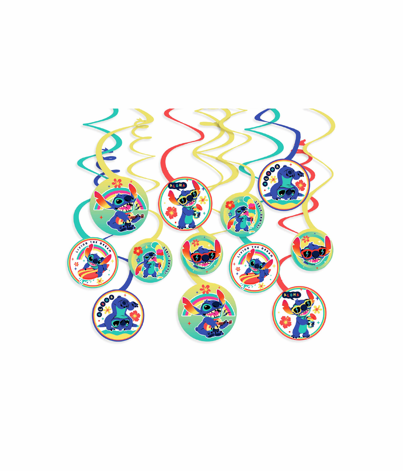 This 12 pack features colourful hanging swirls with fun Stitch cutouts, perfect for brightening up ceilings, doorways, or party tables.