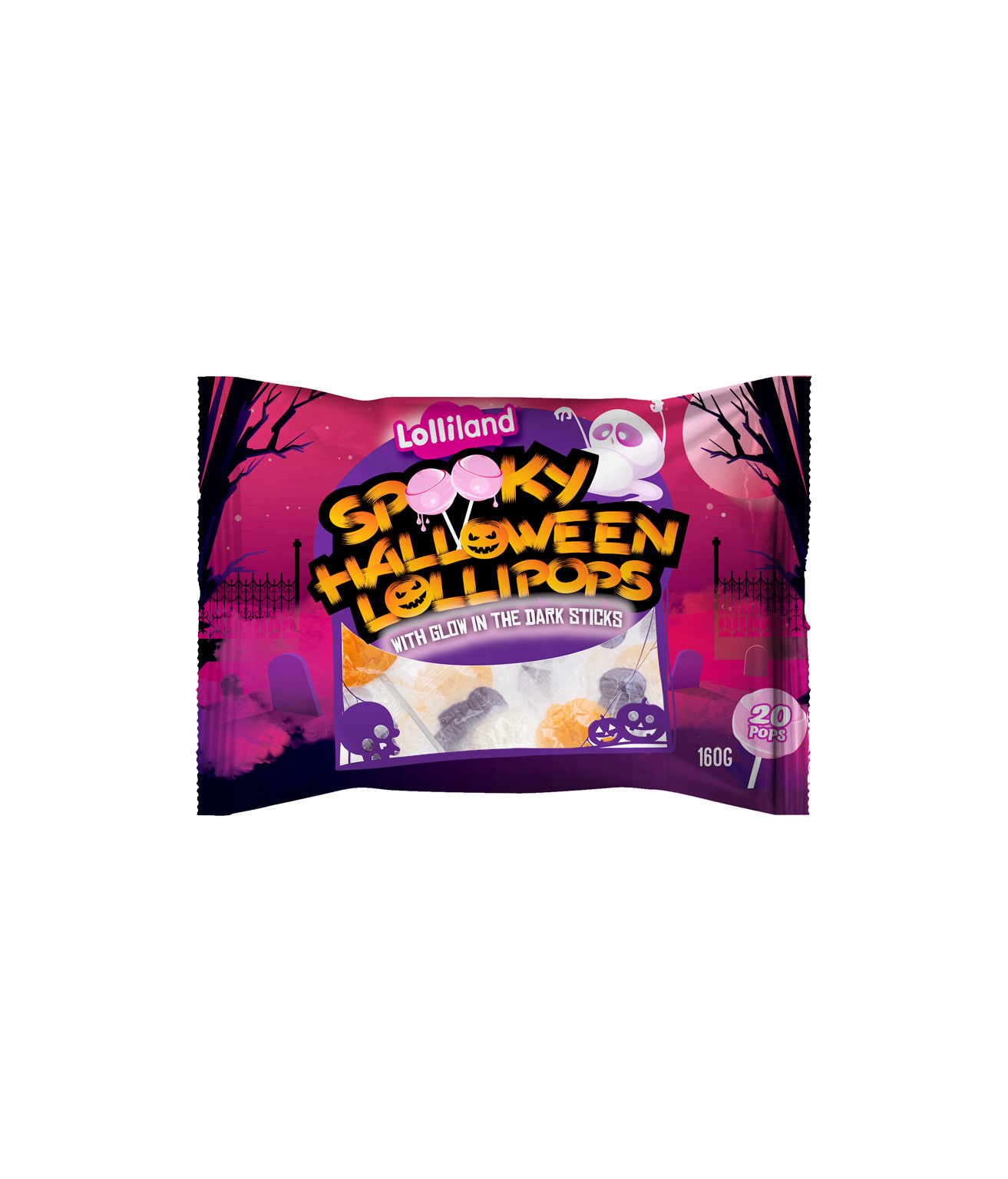Pack of 20 fun, colorful lollipops featuring glow in the dark sticks for extra spooky delight!