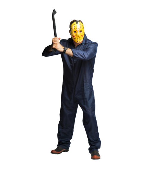 This killer costume for boys features a navy blue jumpsuit with long sleeves and a white face mask.