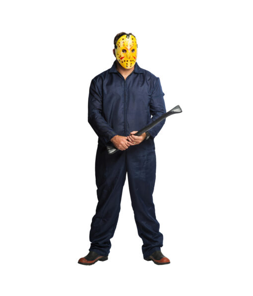Our Mechanic mike costume for mens features blue overalls with hockey mask.