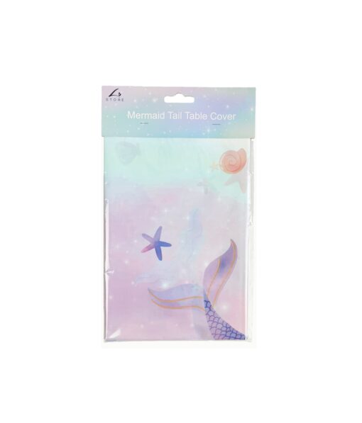 Mermaid Tail Tablecover, measuring 132x183cm. It features mermaid tail and ocean-themed patterns, suitable for covering tables at themed parties or gatherings.