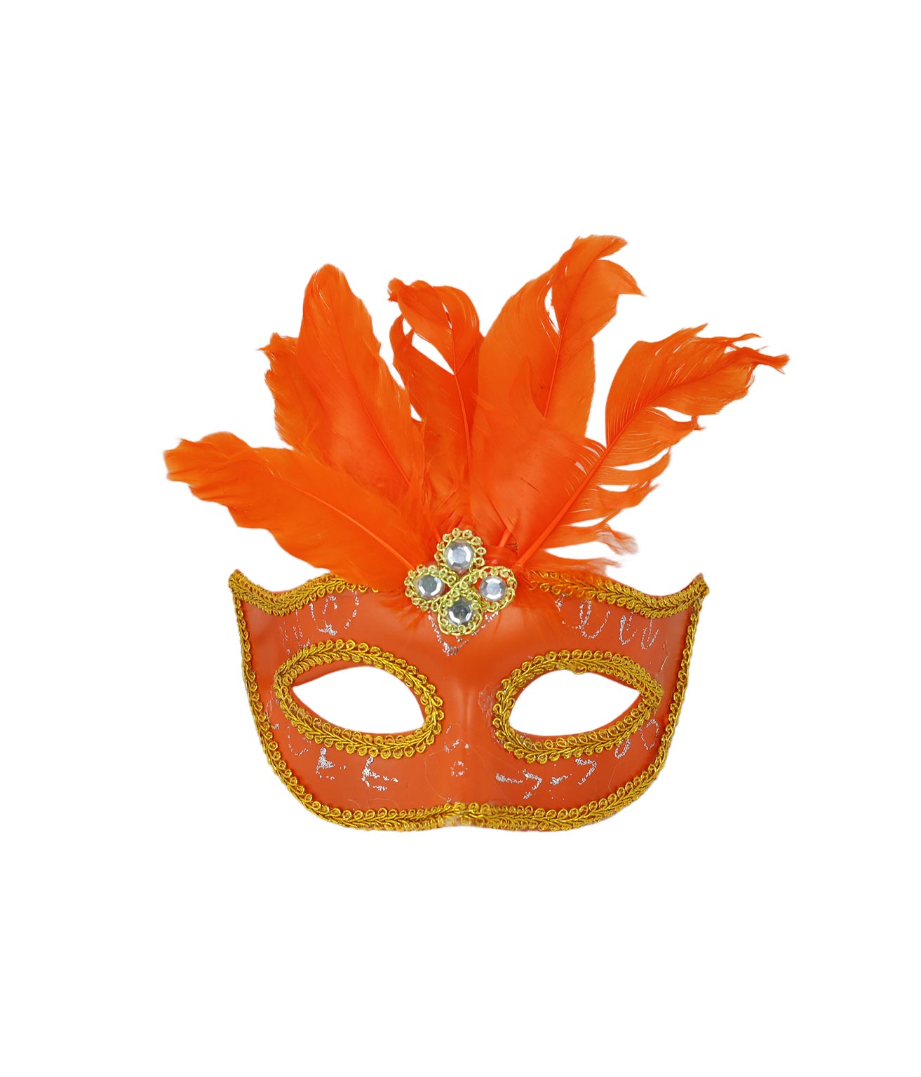 Add a pop of vibrant color to your costume with our Neon Orange Half Mask With Feather.