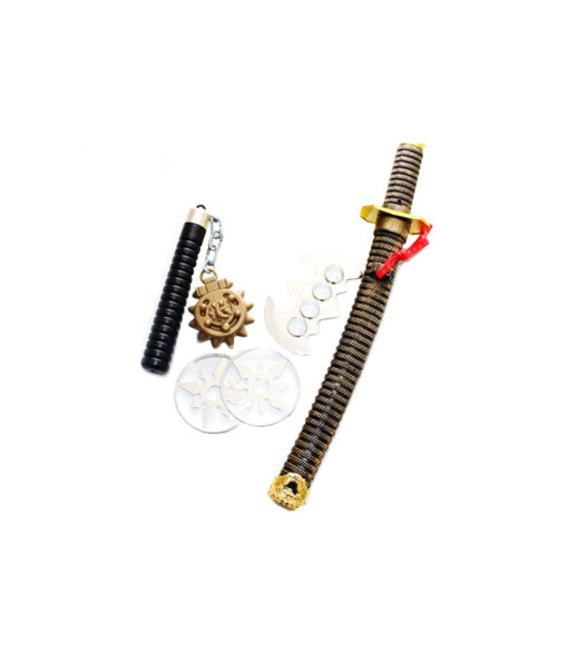 Includes a small sword, two throwing blade disks, nunchucks, and a knuckle weapon for a complete ninja look.