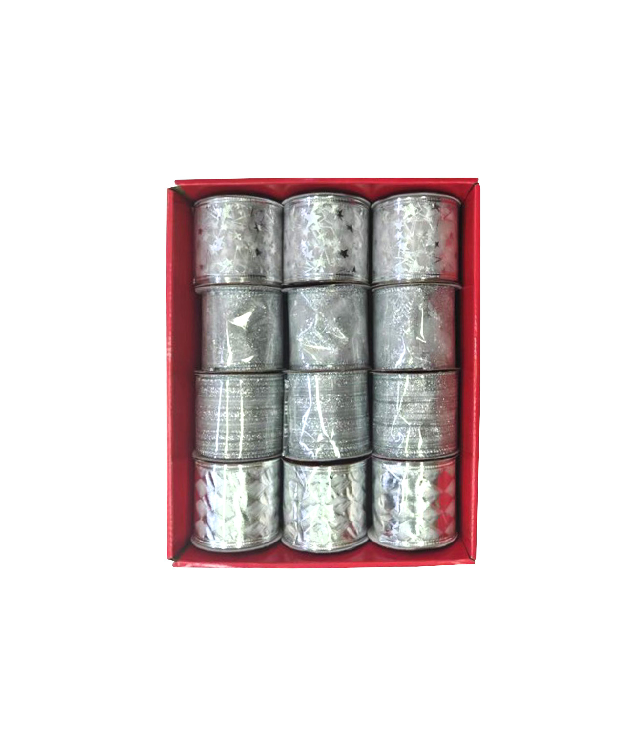 Add a delicate and sparkling touch to your holiday decor with this Organza Silver Christmas Ribbon Assorted 6.3cm x 2.7m.